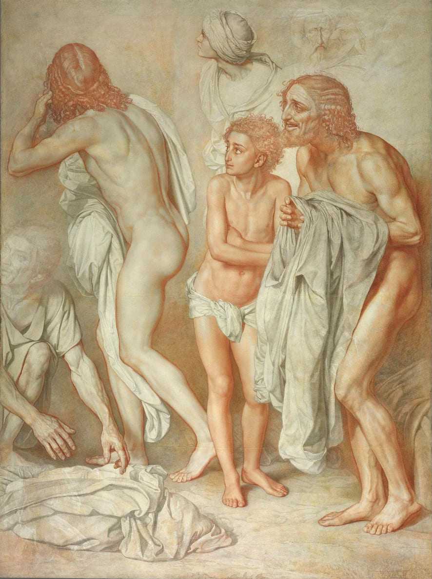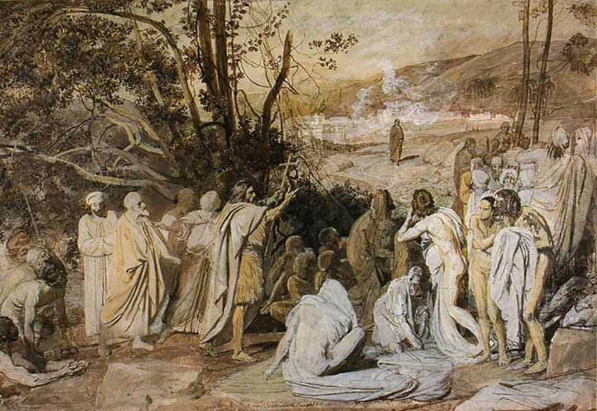 Конечно же, на протяжении многих веков сюжет крещения Христа пользовался необыкновенной популярностью среди европейских художников. Поэтому слова Иванова следует понимать, как желание изобразить Христа так, чтобы в нём узнавался Бог-Спаситель. Основа композиции – это диалог жестов и мимических выражений. Когда были написаны этюды и сформировался окончательно замысел картины, Иванов переехал в другую мастерскую, в которой можно было уместить огромный холст.