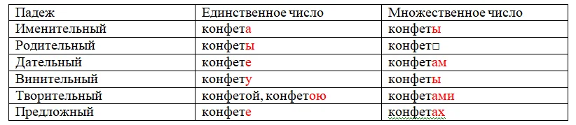 Еще бывает нулевое окончание, как в слове «конфета» из таблицы во множественном числе родительном падеже. Его уникальный значок на письме – □.