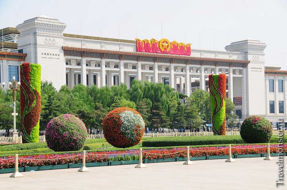 Это самая большая городская площадь и в Пекине, и в мире, которая может вместить до одного миллиона человек одновременно. Ее строительство было приурочено к десятилетию со дня образования Китайской Народной Республики. К этому же юбилею на площади в 1958 году возвели Военный музей Китайской революции. Его экспозиция рассказывает этапы построения Коммунистической партии в стране и развитие революционного движения, начиная с 1919 года. Здесь же расположен и Мавзолей Мао Цзэдуна. Из всех достопримечательностей, расположенных на площади отдельного внимания заслуживают Врата Небесного Спокойствия (XV век). С них начинается территория Запретного города.