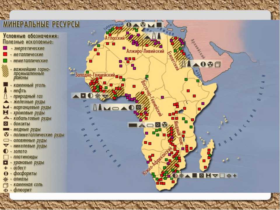 Недра Африки богаты на разнообразные полезные ископаемые, их размещение тесно связано с геологическим строением материка. Залежи рудных полезных ископаемых приурочены к древнему фундаменту платформы.