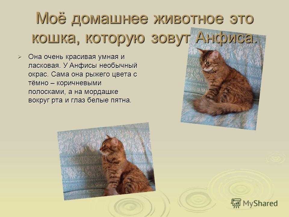 Несмотря на то, что мы живем в квартире, мама с папой разрешили мне завести питомца. У меня есть кошка Матрена и рыбки. Моя кошка – очень интересное животное, она постоянно просится на руки, чтобы ее погладили. Когда она сидит на коленях, Матрена начинает бурчать на всю квартиру. А еще люблю наблюдать, как моя Матрена смотрит за рыбками.