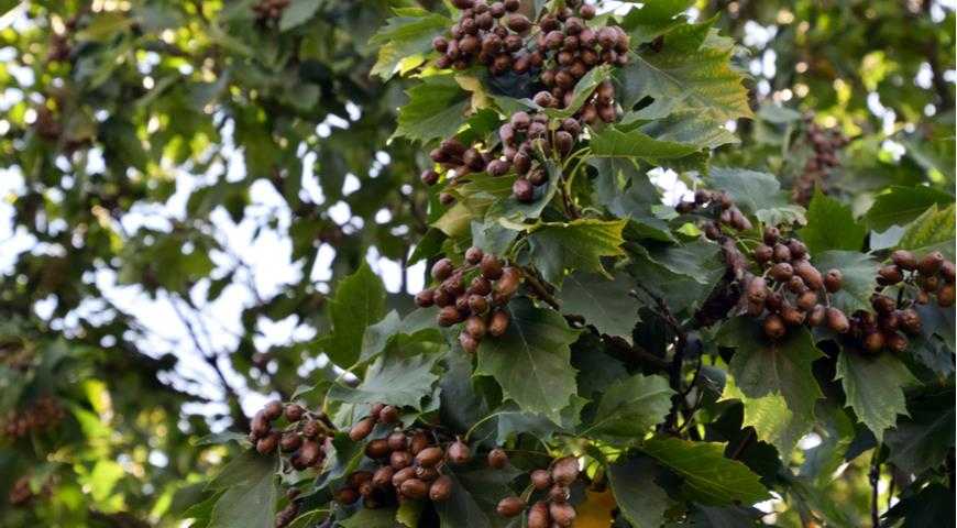 Лист неглубоколопастный, яйцевидной формы, пластина очень тонкая. Сероватый ствол, серебристая крона делают растение особо декоративным.