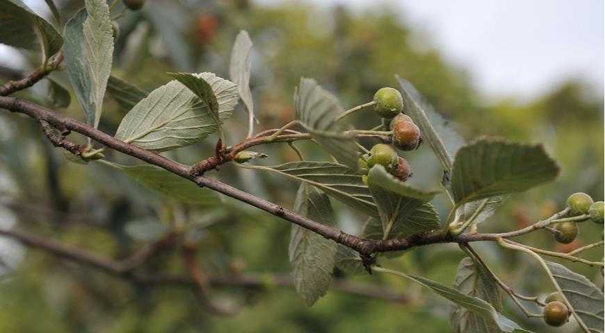 Молодые листья опушены с обоих сторон, по форме они похожи на листья ольхи, цельный кожистый лист с заостренной или тупой верхушкой, с зазубринами по краям. Ее часто называют мучнистой рябиной, к осени листва приобретает серебристо-серый оттенок. Самые популярные сорта рябины арии – «Litescens», «Мagnifica», «VoodLand».
