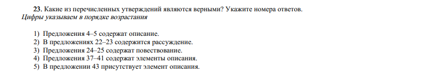 Условие требует выбрать из пяти утверждений о предложениях из текста верные или ошибочные варианты. Сам текст приводится в задании 22.