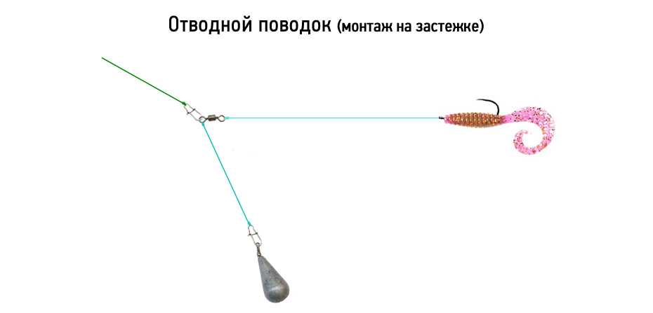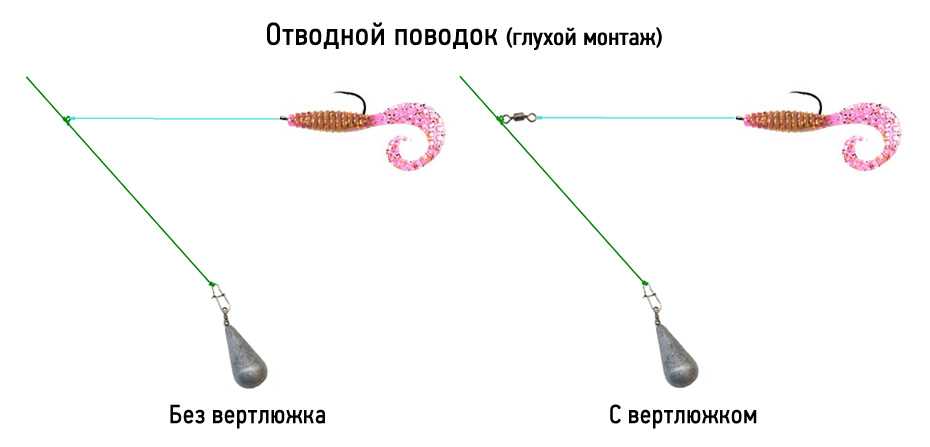 Глухой метод монтажа отводного поводка считается самым простым. Груз закрепляется на конце основной лески, а на высоте 30 см от груза формируется петля. Именно к ней крепится поводок, к которому присоединяется крючок. Также в петлю можно добавить вертлюжок, для крутящихся приманок, что улучшит их поведение в воде.