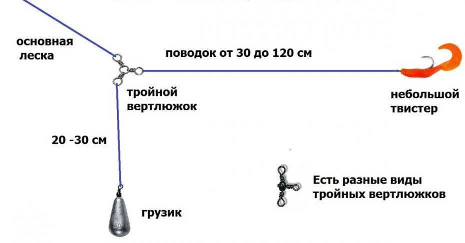Начинающие рыболовы часто используют монтаж с тройным вертлюгом, изготовить который ещё проще, чем предыдущий. Делается он следующим способом: