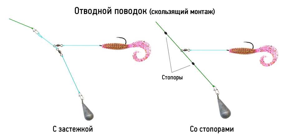 Также существует вариант скользящего монтажа отводного поводка с помощью стопоров. На основной шнур устанавливается вертлюжок, который сверху и снизу фиксируется резиновыми стопорами а к концу привязывается груз. Для скользящего варианта используется поводок длиной от 20 до 30 см.