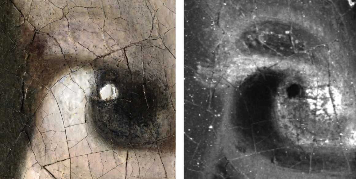 Маурицхёйское исследование. На первом снимке (слева) — трехмерная микрофотография правого глаза девушки. На втором (справа) — факт того, что художник написал ресницы коричневой краской.