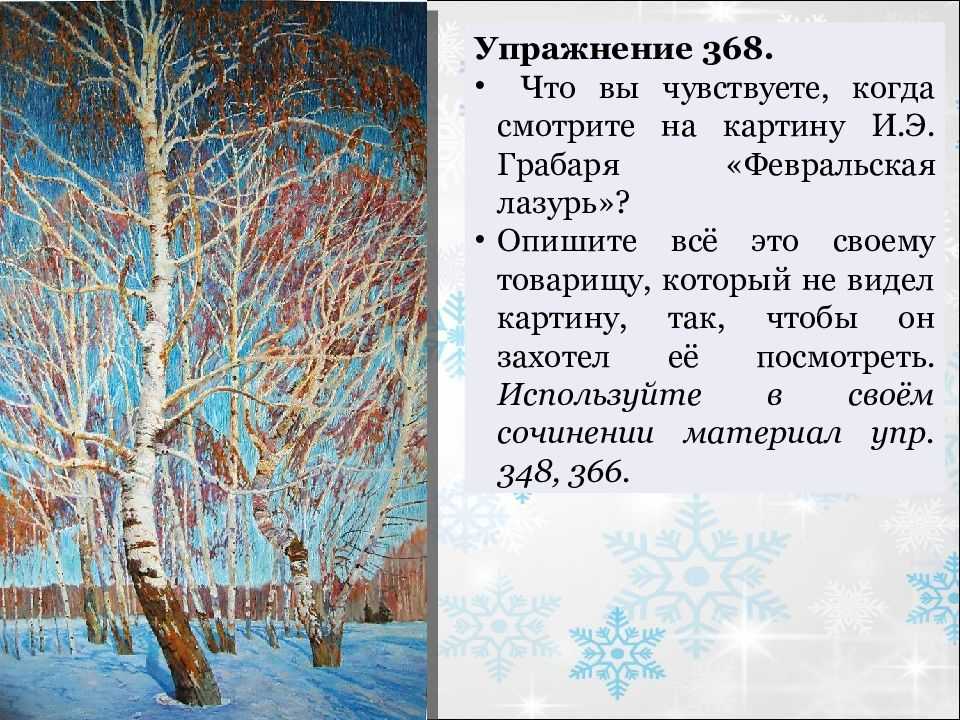 По этой схеме не составит труда написать сочинение по картине Февральская лазурь и в 4-ом и в 5-ом классе.