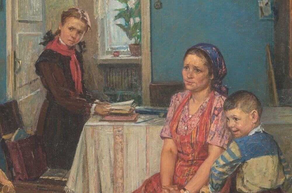 Полотно Фёдора Решетникова имеет немало интересных деталей. С первого же взгляда становится заметно, что в семье нет отца. Вероятнее всего, он погиб на войне. Однако бедствующими этих людей не назовёшь. Мы видим ковёр, велосипед и часы. Для 1952 года, когда люди ещё пытались оправиться от военных потрясений, это были предметы роскоши, которые могла позволить себе далеко не каждая семья.