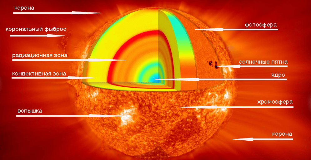 Сегодня исследователи выделяют три внутренних слоя святилы: плотное ядро, которое и разогревает звезду, зону лучистого переноса и зону квантового переноса.