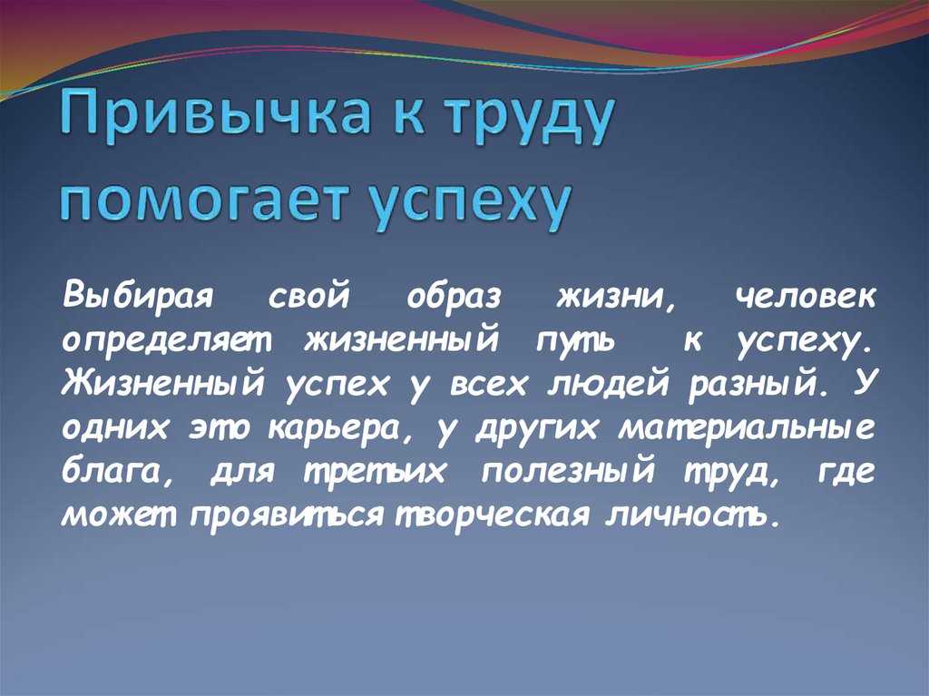 Вот допустим, жизненный успех, для него до сих пор не нашли общего понятия. Как выяснилось для большинства это деньги, но это только временно. То есть иметь материальное благополучие. Но также есть и мнения, что это семья и дом. Если же у человека будут деньги, он будет делать близких ему людей. Так же можно и сказать про другого в противоположном направлении, так как у каждого разное понимание и мечты. Я считаю, чтобы человек добился успеха, он должен иметь упорство и терпение. Ведь если же он начнет, а потом поймет, что на это нужно время и силы. Многие могут это бросить, а другие дойти до конца. Я считаю, что успех в моем понимании, это что-то вроде игры, которые мы должны пройти. И когда же мы пройдем ее, получим тот самый большой приз — успех. А в нем и заключаются наша сила воли и все достижения жизни.