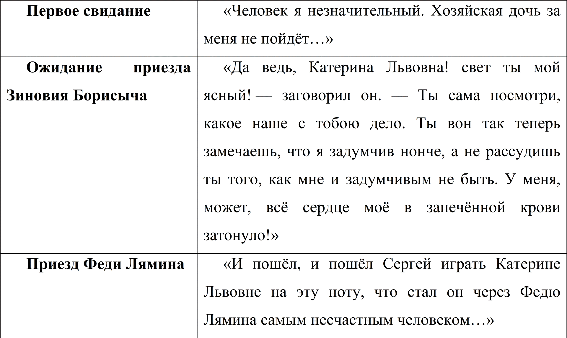 Сергей же, конечно, не влюблен в нее. Ему льстило быть любовником хозяйки, он человек подвластный. Сильный характер Катерина Измайловы подавляет и заставляет его подчиняться. Но уже на каторге, он пытается отделаться от нее.
